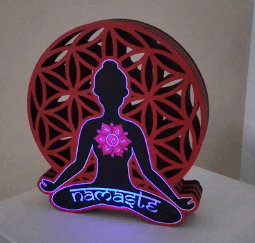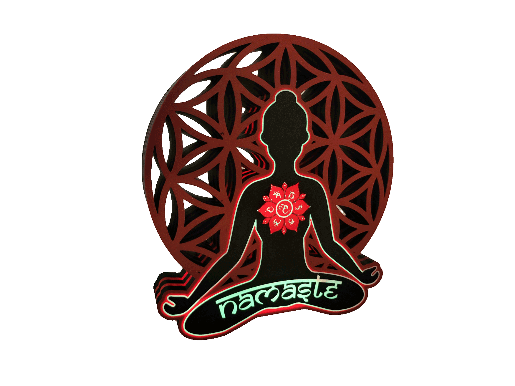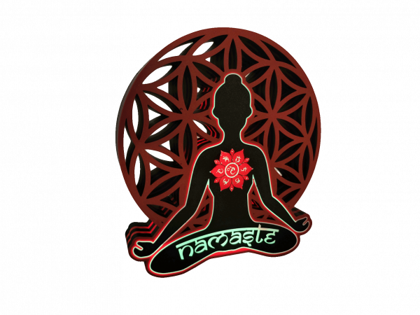 - Features: Namaste-Schriftzug, meditierender Buddha im Lotussitz, Blume des Lebens und sieben Chakren-Symbole